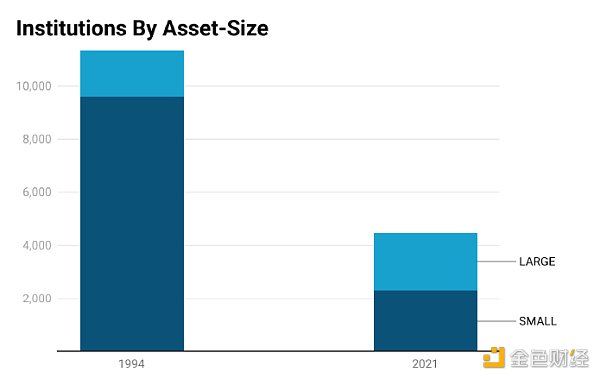 随着银行数量的减少,我们也看到了行业内的整合。下面是 1994 年到今天的小型和大型银行数量的比较。1994 年,小银行占市场份额的 84%. 今天,这一数字为52%.