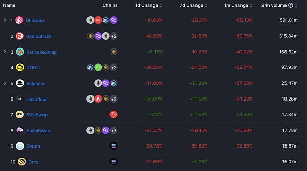毫无疑问,Uniswap是DeFi领域最大的去中心化交易应用。根据DeFiLlama的数据,9月26日,Uniswap 24小时交易量为5.91亿美元,位列所有DEX榜首,比排在第二位的RadioShack多出近2.8亿美元。
